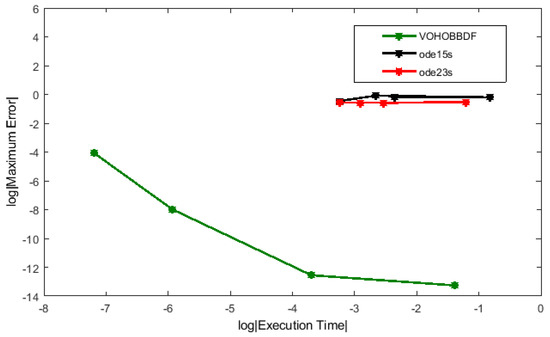 Three different problems were solved directly using the developed method by applying the variable order approach. To analyze the efficiency of applying this approach, the results were compared with two built-in stiff Matlab codes, ode15s and ode23s, which were designed to solve the stiff problems. However, to solve these problems using the Matlab codes, they need to be reduced into their equivalent systems of first order. The accuracy and efficiency of the methods are given in Table 3, Table 4 and Table 5 for comparison purposes. Figure 1, Figure 2 and Figure 3 illustrate the results in Table 3, Table 4 and Table 5.
