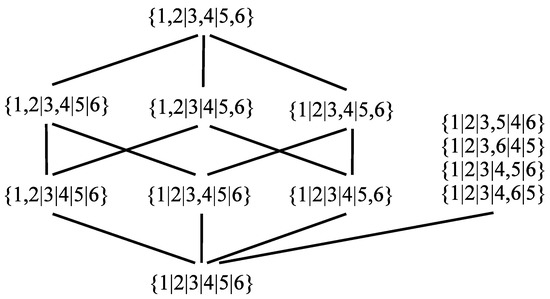 The Hasse diagram of all EE partitions of the graph G in Figure 1. (The four partitions on the right-hand side are actually four separate vertices in the diagram.)
