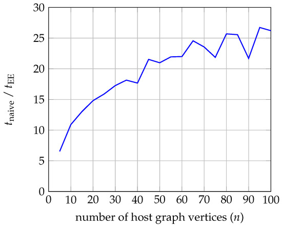 Since all three pattern graphs contain nontrivial automorphisms, the EE-aware algorithm is significantly faster in all cases. As expected, the difference is most pronounced when searching for the occurrences of the graph . The optimal EE partition of this graph has a score of 24; the corresponding values for the graphs and are 2 and 4, respectively. Theoretically, these are the upper bounds for the ratio . However, owing to idiosyncrasies associated with implementation, execution, and time measurements, the actual ratio may also be slightly larger.