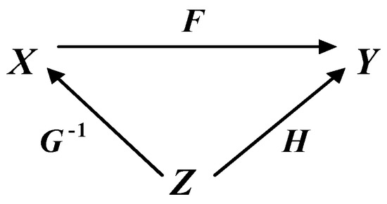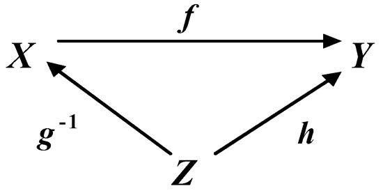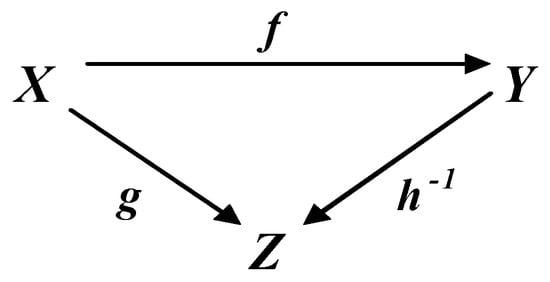 The case shown in Figure 2, is typical, for example, for the application of the realization theorem to the problem of determining regulators in the theory of systems [3,25]. The case of determination of observers—see Figure 3—considered in [3,26] is also equivalent to it. In defining observers, the difference is that the isomorphic map f, some map designated as h−1, and their composition h−1f = g are known and defined in advance. The problem is to define maps h and g−1. By analogy with Figure 2, maps of h and g−1 in Figure 3 can be defined up to class. Due to the equivalence of the problem statements illustrated in Figure 2 and Figure 3, in the future we will solve only the problem reflected in the commutative diagram in Figure 2.