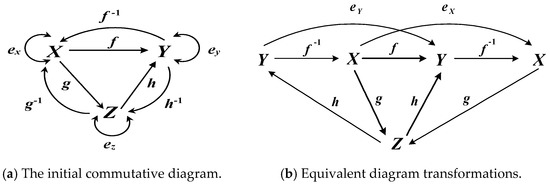 Thus, Equations (4) and (5) for calculating the inverses of g−1 and h−1 are true and can be applied inside the commutative diagram shown in Figure 1. For example, in the simple case where the original isomorphism f—is the usual unit map (in the case of matrices—the usual unit matrix), that is