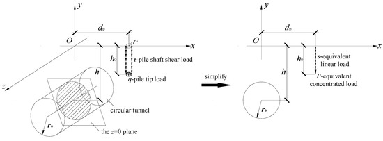 The prediction model for of the potential plastic zone of tunnel excavation adjacent to an existing pile foundation in soils adopted the idea of superposition. Referring to [11,12], this practical problem is simplified into the following analytical mechanics model, as shown in Figure 1.