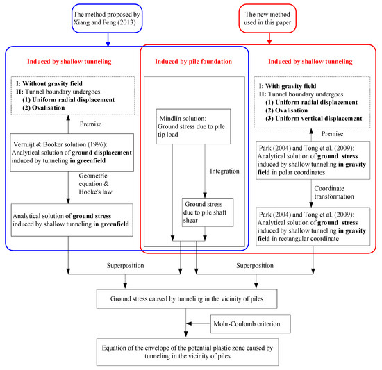 A similar analytical calculation procedure is adopted in this paper to obtain the potential plastic zone induced by tunnel excavation adjacent to a pile foundation in a gravity field. Figure 2 shows the comparison of the calculation procedure in this paper and that in [11].