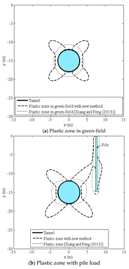 To investigate the difference of the plastic zones in green-fields without pile loads and plastic zones with pile loads, the comparisons between the results obtained from this paper and those in [11] were conducted as shown in Figure 5. It can be seen that the potential plastic zone induced by nearby tunneling presents a butterfly shape when the gravity field is considered, whereas the shape of the potential plastic zone is circular when the gravity field is not considered.