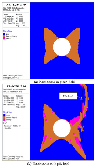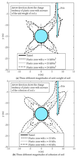 In Figure 7a, the influence of three different magnitudes of unit weight of soil (γ =16 kN/m3, 20 kN/m3 and 24 kN/m3) on the boundaries of the potential plastic zones is plotted. The arrow direction shows the change tendency of the plastic zone with the increase of the unit weight of soil. The results indicate that the boundaries of the potential plastic zone changed slightly with increased unit weight of soil. Four corners of the potential plastic zone extend outward and the midpoints of each side of the potential plastic zone contract inward, which shows that the shape of the potential plastic zone develops towards a butterfly shape with the increase of the unit weight of soil. Moreover, the two tunneling-induced potential plastic zones around the tunnel and the pile coalesce with the expansion of the tunneling-induced potential plastic zone.