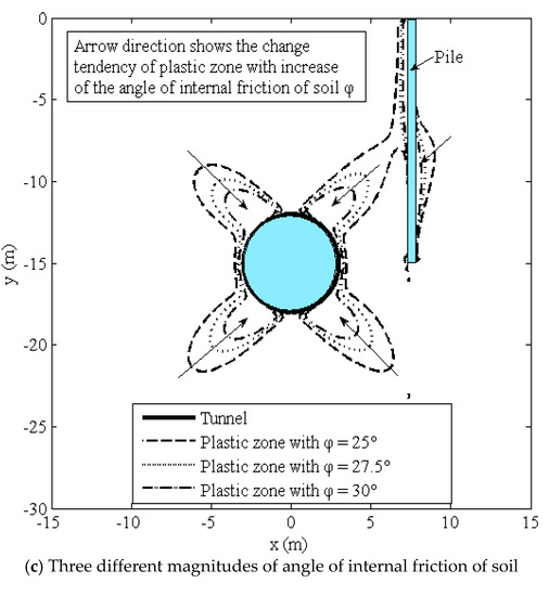 The influence of three different magnitudes of cohesion of soil (c = 20 kPa, 30 kPa, and 40 kPa) on the boundaries of the potential plastic zone is shown in Figure 7b. Figure 7c presents the influence of three different magnitudes of the angle of internal friction of the soil (φ = 25°, 27.5°, and 30°) on the boundaries of the potential plastic zone. The results show that the influence rules are similar to each other. Moreover, it can be observed that when the cohesion or the angle of internal friction of the soil increases, the four corners of the potential plastic zone contract inward and the ranges of the potential plastic zone decrease significantly. In other words, the phenomenon of a butterfly-shaped potential plastic zone is apparent at a relatively low value of cohesion or angle of internal friction of the soil. It is worth noting that if the soil parameters (cohesion or angle of internal friction) are sufficiently large, the two tunneling-induced potential plastic zones around the tunnel and the pile would coalesce, whereas the two tunneling-induced potential plastic zones would separate from each other.