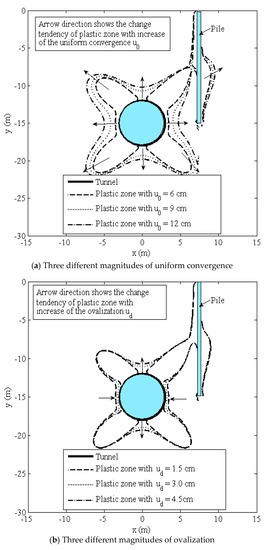 - The uniform convergence of a tunnel primarily affects the range of a potential plastic zone, whereas the ovalization of a tunnel primarily affects the shape of a potential plastic zone. The vertical translation affects both the range and the shape of the potential plastic zone. Moreover, the increase of uniform convergence, ovalization, and vertical translation develops different potential plastic zone shapes; butterfly-shaped, vertical bone-shaped, and fan-shaped, respectively.