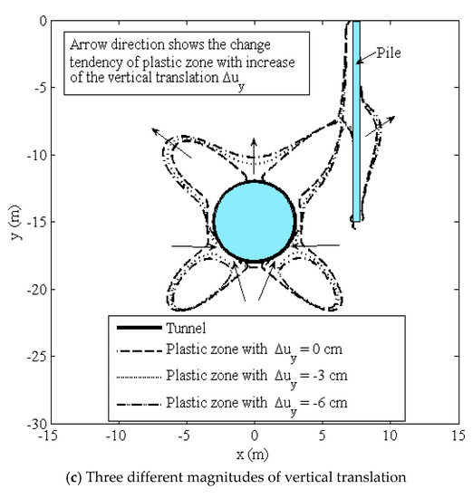 The influence of three different magnitudes of vertical translation (Δuy = 0 cm, −3 cm and −6 cm) on the boundaries of the potential plastic zone induced by tunneling is shown in Figure 8c. It can be observed that when the vertical translation increases, the up side of the potential plastic zone extends outward and the down side of the potential plastic zone contracts inward, which shows that the shape of the potential plastic zone develops towards a fan shape.
