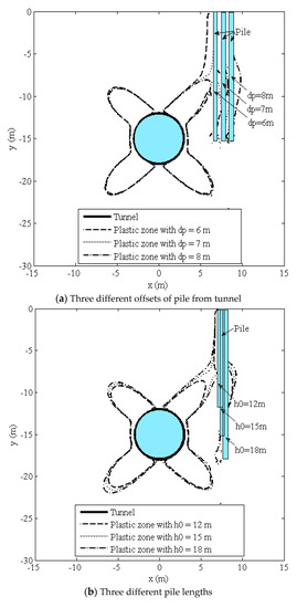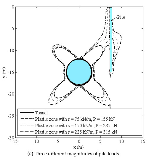 The influences of different pile parameters (pile offsets, pile length and load magnitude) on the boundaries of the potential plastic zones are analyzed in Figure 9. The results indicate that the potential plastic zones near the tunnel and near the pile are connected when the pile is located close enough to the tunnel, the depth of the pile tip is near the level of the tunnel spring line and the pile loads are large enough.
