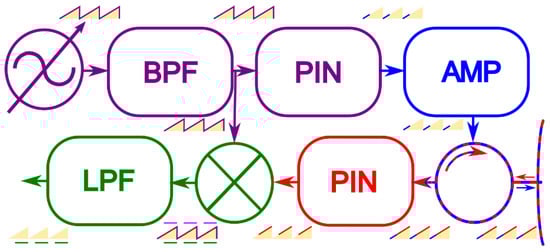 The FMICW system works as a combination of the pulse radar and FMCW (Frequency Modulated Continuous Wave) radar. Examples of FMCW systems are described in [2,3]. The principle of the FMICW radar is described in [4], but this system was developed for the measurement of the ionosphere, and the pulse part of the system does not have a big influence on the signals. The block diagram of the FMICW radar is shown in Figure 1. The signal is generated by the sweeping generator and connected to the output amplifier. The switching of the system is realized via PIN diodes; one is for the connection to the transmitting amplifier and the second is for the receiver. A detailed description of the radar PCDR 35 blocks was realized in [5]. The radar PCDR 35 was developed for the measurement in short distances (less than 10 km) and we must include the influence of pulses in this case, as shown in Figure 2. Because we have different lengths of the reflected signals, we must do corrections of the power. An example of this was described in [5]. The distance in FMICW radars is calculated by Equation (1).