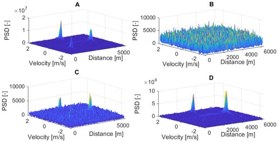 Frequencies are obtained during the primary signal processing of the radar. The frequency analysis can be realized by the non-parametric, or parametric methods [7]. The parametric AR model is described in [8]. More parametric and non-parametric methods are described in [9]. 2D FFT can be used for the estimation of the target velocities, this algorithm is described in [10,11]. The principle is shown in Figure 3. Measured data are sorted in a matrix after every measurement is transformed by the Fast Fourier Transform (FFT). The results from this process are the range profiles for the times of measurement. The next step is applying the FFT on the time dimension. This transformation changes the time dimensions to Doppler shift dimensions. The Doppler shift resolution is defined by Equation (2). The testing measurements of the radar PCDR 35 and sensitivity analysis were presented in [12]. Examples of four cases of 2D spectra are shown in Figure 4, where PSD is power spectral density. The clutter elimination is described in [13], where the static clutter detection and the meteorological clutter is canceled by the Airborne Moving Target Identification (AMTI) filter. It represents selected velocities for all distances in the case of the signal 2D spectrum.