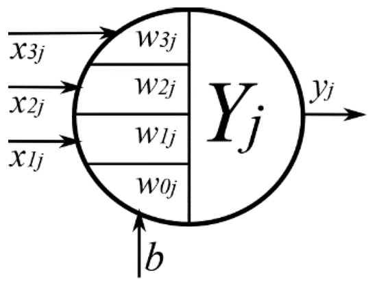 where Y j is the application function of a neuron, x i j represents i-th neuron input, w i j represents the weight for the input (synapse), b represents bias and N represents number of inputs.