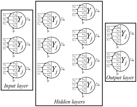 The neural network is composed of the basic neurons. Neurons can be sorted into more layers. These layers are sorted into groups known as the input layer, hidden layers and output layer. An example of the neuron network in topology (3-3-4-2) is shown in Figure 6. This is the neural network with more layers. The connection between neurons can skip to any layer or can be realized as the back loop.