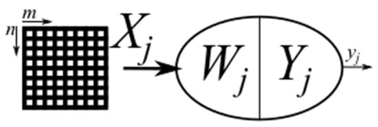 Neurons in this layer transform the 2D spectrum (the original spectrum is represented by the size of the spectral components) to a binary matrix, where 1 represents the positive detection and −1 represents the negative detection in the tested cell. In this layer there are used two types of neurons, one type is used for the filtration and the second type is used for the threshold value estimation. This value is used in the filtration neurons for the activation function. From this, it is obvious that the numbers of neurons for the filtration and the thresholding in the input layer are functions of the 2D spectrum size. The model of this neuron is shown in Figure 7. Input signals are in the input vector X j . This vector has n elements and these elements are obtained from the distance profile. Synapses are saved in the vector W j , and activation function Y j is the signum function. The neuron’s model for the threshold value estimation is shown in Figure 8. The activation function Y j of this neuron is linear, the input is the matrix of the 2D spectrum from the radar measured data. This neuron has common weight for all inputs because all inputs have the same priority. This neuron definition is shown in Equation (4), where T V represents the threshold value (5).