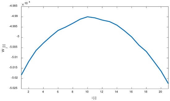 After the input network learning, we will obtain weight parameters for the filtration neurons. These weights are shown in the graph in Figure 10, and these parameters will be set by Equation (3). Weights are saved in vector W J from Figure 7. The weight for the neuron threshold value estimation was estimated from the learning as 113.3817189 × 10−6. A test of the layer application is shown in Figure 11. The 2D spectrum with three targets was used for input to this layer.