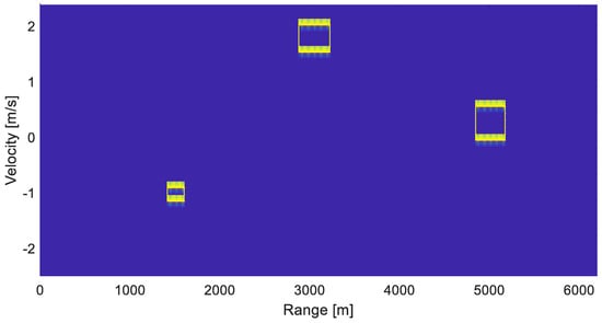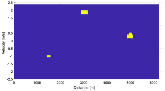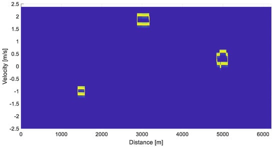 The neural sub-network for the transformation of the area is shown in Figure 15. The first layer is from neurons described by Equation (9). This is the OR function which depends on the vector length. For the Doppler shift dimension, a vector where n is 21 elements is used, and for the range dimension, a vector where m is 81 elements is used. The tested element is in the vector middle in both cases. The equation for the OR neurons which are used for the transformation of the area is described by (9). It was derived from the Hebbian learning for more lengths of the input vectors. The output layer is the AND neuron, which is described by Equation (10). The signum function is used for both neuron types in this neural sub-network. For the second step, the same layer is used as in the case when we detected the board lines of the targets after the thresholding. The output from the application of this layer is shown in Figure 16.