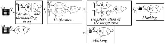 The neurons, with nine inputs in this layer, are organized in the 3 × 3 matrix of elements. Inputs are connected from layer 1 (inputs can be 1, or −1). The activation function is the signum function. The model of this neuron is similar to the neuron from Figure 8, only another activation function and different bias are used. This layer is used for the definition of the target board lines. The neuron tests if the middle element is −1 and if there are any elements with 1 around. If these conditions are not successful, the output is −1. If conditions are successful, the output is 1. After the Hebbian learning we obtained an equation, which cannot be used, because in the case when all inputs are −1 the output is wrong. The layer generated the positive board line of the target and the first condition was not successful. Then we used this case more times for the Hebbian learning and we trained this neural network until the neural network started to analyze this case correctly. We obtained Equation (8) from this training. Input x9j represents the middle element in the matrix 3 × 3, the weight for this element is −8, the weight for the other elements is 1. This is because these elements have the same priority and the value −0 is for bias (for the Hebbian learning we were using eight cases for positive detection and eight cases for negative detection). Application of this layer is shown in Figure 14. Input for testing of this layer is the output from the thresholding layer, which was shown in Figure 11 after the unification of the targets. We can see that the 2D spectrum was analyzed correctly.
