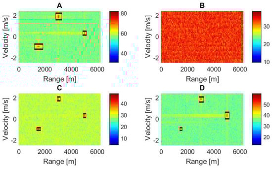 Figure 18. Marking of the targets in 2D spectrum: (A) processing of the signal with three strong echoes, (B) processing of the signal without echoes, (C) processing of the signal with three weak echoes and (D) processing of the signal with one weak and two strong echoes.