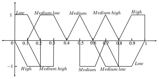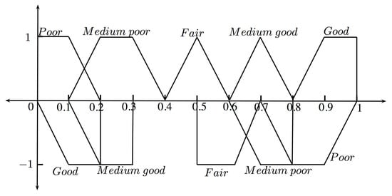 Identify and define the appropriate linguistic variables and their corresponding membership values to estimate the ratings of alternatives with respect to criteria. Two sets of suitable linguistic variables in the form of trapezoidal bipolar fuzzy numbers are used for the assessment of bipolar fuzzy ratings of cost and benefit criteria given by decision-makers, shown in Figure 2 and Figure 3, respectively. The values of trapezoidal bipolar fuzzy numbers are considered within the numerical domain .