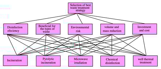Health-care waste treatment organization is a high-priority environmental, public, and health concern in developing countries. These organizations work on destructing waste materials, and to do so, use different waste treatment strategies, such as incineration, steam sterilization, Rotary kiln, Pyrolytic incineration, single-chamber incineration, wet thermal treatment, microwave irradiations, and landfill processes. Assuming that health-care management has to select a waste treatment method to decompose waste minerals and other chemical or pharmaceutical infectious waste, after initial screening, the management will select five well-known methods for further evaluation that include Incineration, Pyrolytic incineration, Microwave irradiation, Chemical disinfection, and Wet thermal treatment. A group of three decision-makers is decided upon to evaluate these five alternatives on the basis of five conflicting criteria, such as Disinfection efficiency, Beneficial for the types of waste, Environmental risk, Volume and mass reduction, and Investment and cost. and are benefit criteria, whereas and are considered as cost criteria. The framework for evaluating the waste treatment strategy is provided in Figure 4.