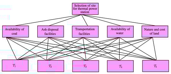 A thermal power station is a power station which converts heat energy into electrical energy by means of coal combustion. It is most important to choose a site for a thermal power station, as it needs a huge capacity of land and position to bear the static and dynamic pressure during the whole process. Suppose that the government wants to plant a thermal power station to meet the requirements of electric power. After the initial survey, five locations, such as , and , are chosen for further assessment. A group of three decision-makers is appointed to examine these locations on the basis of a set of five criteria, including Availability of coal, Ash disposal facilities, Transportation facilities, Availability of water, and Nature and cost of land. Here, , and are considered as benefit-type criteria, whereas and are cost-type criteria. The framework for site-selection for a thermal power station is given in Figure 5.