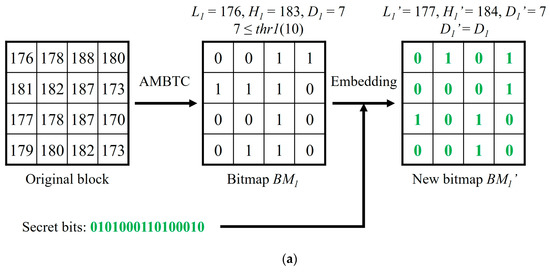 For the first compressed code (176, 183, BM 1 ), the difference D 1 = 7 < thr1, so the block belongs to the smooth blocks, and BM 1 can be totally replaced by 16 bits of secret data, as shown in Figure 2a. Then, use Equations (7) to (10) to calculate two new quantization values L 1 = 177 and H 1 = 184 . Even when the two quantization values are changed, the value of the difference between them is maintained.