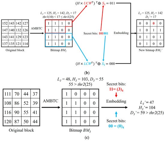 In this section, we will use three simple examples to illustrate the data embedding and data extraction phases of our proposed method. Three 4 × 4 sized blocks of the original image are assumed in the Figure 2a–c, i.e., (176, 178, 188, 180; 181, 182, 187, 173; 177, 178, 187, 170; 179, 180, 182, 173), (152, 143, 142, 127; 147, 140, 132, 126; 143, 141, 129, 123; 137, 135, 121, 114), and (111, 70, 44, 37; 108, 86, 52, 39; 116, 90, 55, 41; 120, 87, 50, 44). After being compressed by AMBTC, three compressed codes (176, 183, BM 1 ), (125, 142, BM 2 ), and (48, 103, BM 3 ) are obtained. We set thr1 = 10 and thr2 = 25.