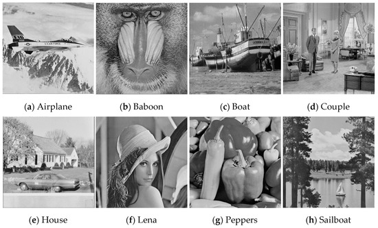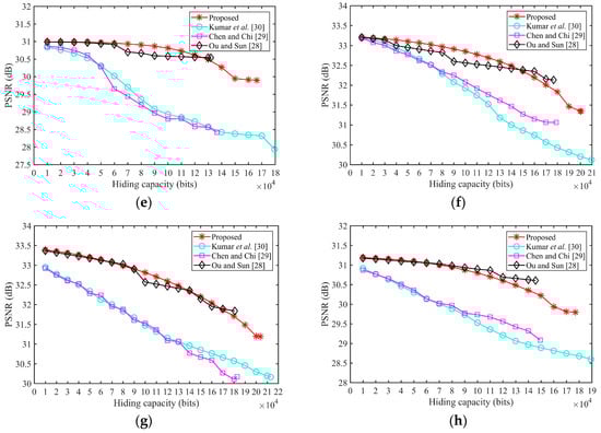 Figure 5. Comparison of peak signal-to-noise ratio (PSNR) among different methods for eight test images: (a) Airplane; (b) Baboon; (c) Boat; (d) Couple; (e) House; (f) Lena; (g) Peppers, and (h) Sailboat.