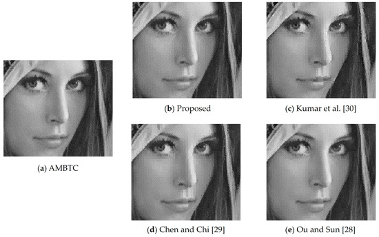 Three relevant data hiding methods which embed data into AMBTC compressed images while preserving the final file size that were proposed by Ou and Sun [28], Chen and Chi [29], and Kumar et al. [30] are used to compare with our proposed method. For a fair comparison, two thresholds are set to the same values in the four methods. The visual comparison is shown in Figure 4. We can see that in (c), noticeable distortions appear on some edge regions such as the bridge of the nose and the eyebrows. In (d), there are some black points in the white blocks or some white points in the black blocks on the edge. The stego-images of our proposed method and Ou and Sun’s method are closer to the original AMBTC compressed image.