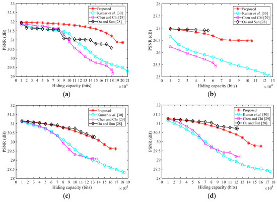 Kumar et al.’s method achieves the highest hiding capacity; however, the image quality is the worst. In the Ou and Sun method, the PSNR will not change when embedding bits into complex blocks. Therefore, the image quality of [28] is the best, but the hiding capacity is the lowest in most images. Our proposed method can achieve the second highest hiding capacity, i.e., only lower than [30]. In addition, our proposed method can achieve a relatively higher image quality. This is especially the case in smooth images such as Airplane, where the PSNR of our proposed method is the highest, and in Lena, when hiding capacity is lower, the PSNR of our proposed is also the highest. In Figure 5a, the PSNR of the other methods are rapidly declining when hiding capacity is higher than 8000 because the image becomes complex in the rear areas. Due to the hiding order of our proposed method, the PSNR of our proposed method will decline slowly with the increasing amount of hiding data. Therefore, our proposed method can achieve an excellent balance between image quality and hiding capacity, and can obtain high-fidelity images when the hiding amount is lower.