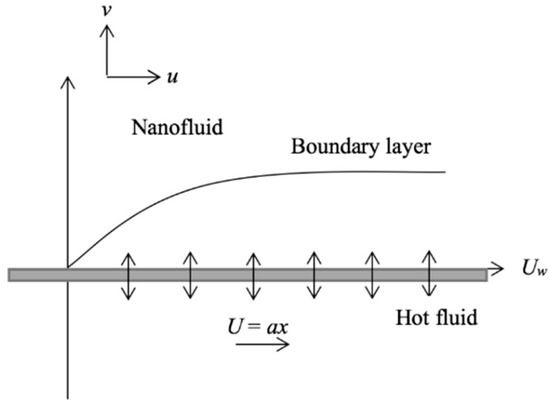 Consider a steady axisymmetric thermal conductivity, laminar, incompressible, and one-dimensional flow in a nanofluid towards a permeable stretching sheet is placed on the plane y = 0, where y and x are Cartesian coordinates estimated along the stretching surface and typical of it, respectively. The flow is limited at y > 0. The sheet is extended with a speed Uw = ax along the x-direction while assuming the pressure gradient and external force to be zero, where a is a positive constant value. Further, we assume that the flat plate is heated from below by a hot fluid whose temperature is Tf, with a heat transfer coefficient hf. The scheme of the physical configuration is depicted in Figure 1.