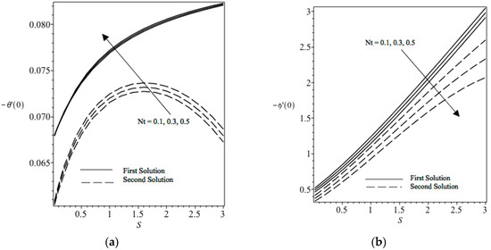 (a) Reduced local Nusselt number with the parameter of mass suction S for different Nt values. (b) Reduced local Sherwood number with the parameter of mass suction S for different Nt values.