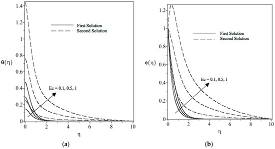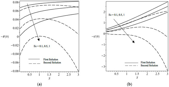 The nanoparticle and temperature concentration profiles for different values of Eckert Ec are respectively shown in Figure 6b and Figure 7a for a stretching surface when all governing parameters are fixed. It is discovered that there are two different profiles for different layer thicknesses with a given mass suction parameter S, which supports the existence of a dual solution, as illustrated in Figure 5a,b. It is found that when Ec increases, the nanoparticle and temperature concentration profiles will decrease and, hence, tend to increase the nanoparticle and thermal boundary layer thicknesses. Figure 7a illustrates the power of the Eckert number Ec on temperature in the boundary layer. By studying the graph, the values of Ec increase when the wall temperature of the sheet increases. This is due to the decrease of heat transfer rate at the surface; thus, the thickness of the thermal boundary layer increases when the value of Ec increases.