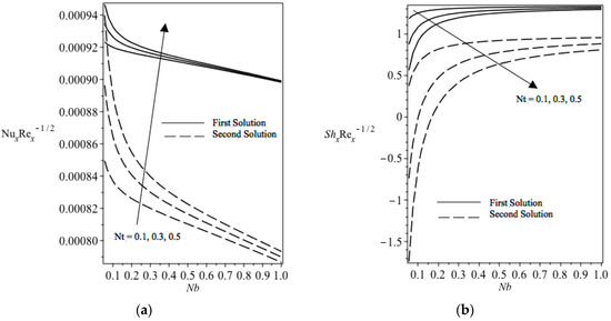 (a) Reduced local Nusselt number with Nb for different Nt values. (b) Reduced local Sherwood number with Nb for different Nt values.