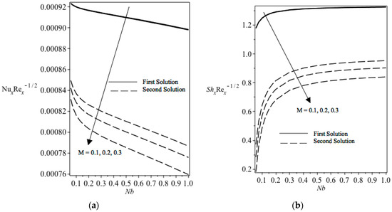 (a) Reduced local Nusselt number with Nb for different M values. (b) Reduced local Sherwood number with Nb for different M values.