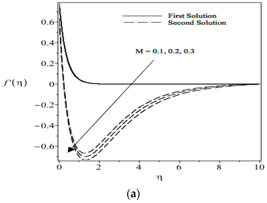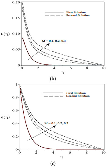 Figure 8a indicates the effect of the magnetic field on the flow field. With the existence of a transverse magnetic field, the fluid induces the Lorentz force, which opposes the flow. This resistive force favors flow deceleration, which results in the decreasing velocity field seen in Figure 6a. We can see that when increasing the value of the magnetic parameter M, the retarding force is also increased along with a reduction in velocity. Figure 8a also shows that when the value of magnetic parameter M increases, the boundary layer thickness is reduced. Figure 8b,c shows that the transverse magnetic field value causes the thermal boundary layer nanoparticle concentration boundary layer to be thicker. This can be explained by the temperature and nanoparticle concentration increment in the boundary layer when the magnetic field is increased.