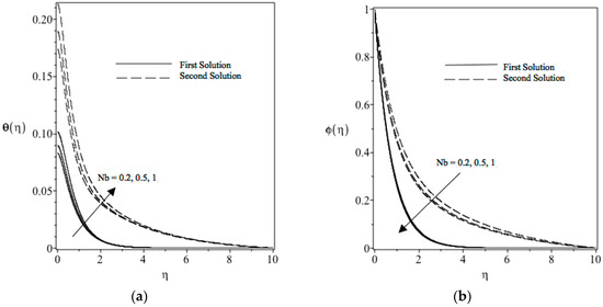 Figure 9a shows the change in the parameter of Brownian motion, Nb, on the temperature profile. Based on our observation, an increase in the Brownian motion parameter leads to temperature increase in the boundary layer. As Brownian motion increases, nanoparticles emigrate from the hot surface towards the cold ambient fluid and, because of that, the temperature will increase in the boundary layer. This will help in thickening the boundary layer. Figure 9b reveals the concentration profile. The concentration profile is a decreasing function of Nb. The reason for this may be that the decrease in the Brownian motion parameter will reduce the mass transfer of a nanofluid.