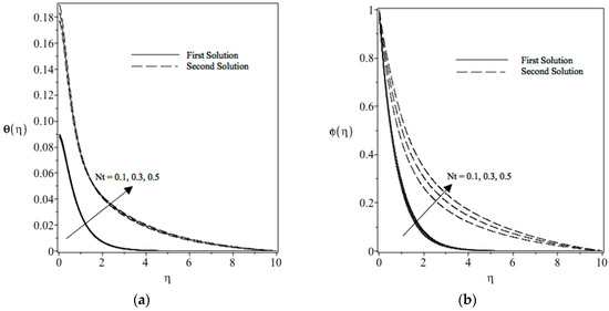 Figure 10a shows the change in the thermophoresis parameter Nt on the temperature profile. When the thermophoresis parameter increases, the temperature increases in the boundary layer. As the thermophoresis effect increases, nanoparticles emigrate from the hot surface towards the cold ambient fluid and, because of that, the temperature will increase in the boundary layer. This will help in thickening the boundary layer. Figure 10b reveals the variation of the concentration profile. The larger values of thermophoresis parameter Nt in 5a lead to larger temperature differences. The concentration field is driven by the temperature gradient. When the temperature is an increasing function of Nt, a rise in the Nt parameters causes the concentration and the boundary layer thickness to increase.