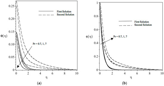 Figure 11a displays the variation of temperature profile with the Prandtl number Pr. The effect of the Prandtl number, Pr, is that an increase in Prandtl number Pr will lead to a decrease the temperature field. Increasing the value of Pr indicates that momentum diffusivity is greater compared to thermal diffusivity. As a result of this, the thermal boundary layer thickness represents a decreasing function of Pr. Figure 11b shows that the momentum diffusivity dominates as the Prandtl number Pr increases. As a result of this, the nanoparticle concentration and boundary layer thickness represent an increasing function of Pr.