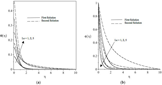 (a): Le effect on the temperature profile. (b) Le effect on the nanoparticle concentration profile (Pr = 1, Nb = 0.5, Nt = 0.5, = 0.1, n = 2, Du = 0.1, Sr = 0.1, M = 0.1, S = 2.5, Bi = 0.001, and Ec = 0.1 when = 1).