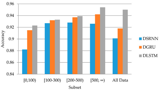 In the experiments on the Sina Weibo dataset, the proposed DRNN models show good performance. From Figure 3, DLSTM is the best model in accuracy. Its best result is about 1.5% higher than the DGRU model and 3% higher than the DSRNN. From Table 4, The DLSTM outperforms the GRU-2 model in [22] and CI model in [23], which are also two kinds of RNN models. Furthermore, the RNN models are about 10% higher than the SVM model, which shows that the RNN models have greater advantages over traditional methods.