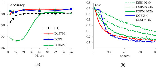 The accuracy curves of the proposed DRNN models are presented in Figure 4a accompanied by a curve of GRU-2 from [22]. The loss curves are presented in Figure 4b.