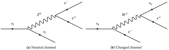 The disintegration can be produced two different ways—a neutral channel, mediated by a boson , and a charged channel, mediated by a boson (Figure 1a and Figure 1b, respectively). However, one should consider the charged channel as an additional contribution to the neutral channel only for electron neutrinos, that is, roughly 1/3 of the time during superluminal propagation due to the phenomenon of neutrino oscillations. As a first approximation, we can neglect it and consider the neutral channel as the dominant one. With this simplification, the process has been characterized in Reference [18]: