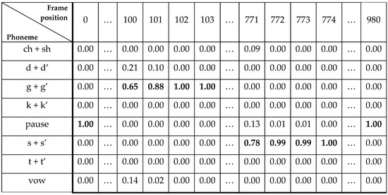 As a result, we obtained a sequence of labels. Many labels were certainly repetitive because a phoneme lasted a few milliseconds and frames were overlapped. The algorithm of removing the duplicates and calculating the phoneme’s start and end points was considered further.