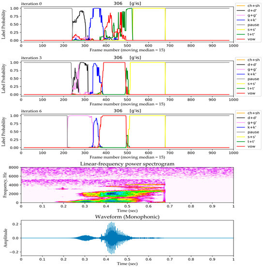 Example of an output label sequence at each time step. “Iteration 0” represents the output of the speaker-independent neural network. Starting from the first iteration, the neural network becomes speaker-dependent. “Iteration 3” and “Iteration 6” allow us to see the progress of retraining.