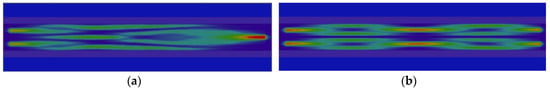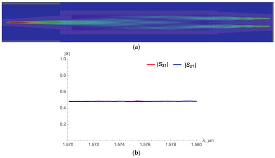 The operational diagram of MZM is shown in Figure 1. First, the optical part of MZM contains two grating couplers (which are omitted on the diagram) for the input and output of optical signals. The couplers are designed to have a maximum efficiency at 1.55 μm wavelength. After entering, the optical signal is guided by the rib waveguide to the multimode interference (MMI) divider, which evenly splits it to two symmetrical paths. In order to design an MMI divider, the self-imaging theory (SIT) [] was implemented. Within the framework of SIT, the optical intensity distribution in the multimode structures is repeated after a distance 3Lπ, where Lπ = π/(β0 − β1) is the beat length of two lower-order modes of the structure, while it splits into N repeating images at the distance L = 3Lπ/N. If the designed device has a symmetrical structure, the minimum distance for N-folded image is reduced to L = 3Lπ/4N. For the designed MMI divider, the beat length is Lπ = 263 μm, and subsequently the distance for two folded images is L2 = 98 μm. In order to verify the theory correctness and initial design, the physical simulation of the MMI divider with EM software is performed; this also allows us to adjust the initial design. The final MMI length for two folded images was chosen to be L2 = 94.5 μm which is close to the theoretical value of 98 μm. The results of simulation for field distribution and transmission spectra of the MMI divider are shown in Figure 2a,b, respectively. The same MMI structure is used as a combiner in MZM, and the results of its simulation are presented in Figure 3 for in-phase (a) and out-phase (b) ports excitation.