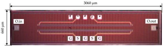 In order to define the length of the modulator segment, the test (prototype) MZM is designed and produced (Figure 4). The phase shifter length for designed MZM was chosen to be 1.9 mm as a compromise between losses at high frequencies and half-wave voltage Vπ. After producing, we can directly measure the key parameters of the test modulator such as half-wave voltage-length product, extinction ratio, load capacitance, and insertion losses.