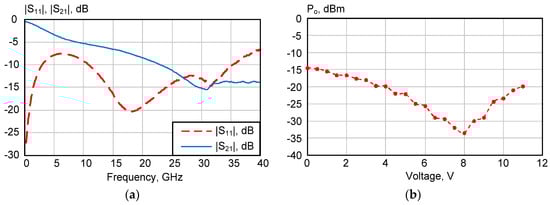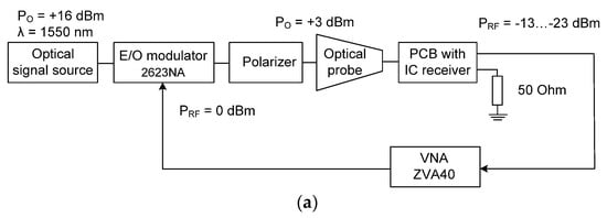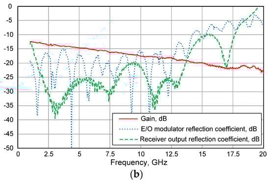 A block diagram of a setup for microwave photonic link measurement is depicted in Figure 14a. The optical signal with output power PO = +15 dBm at λ = 1550 nm is modulated by vector network analyzer (VNA) ZVA40 (PRF = 0 dBm) and E/O modulator Lucent 2623NA. A polarizer was used to tune the light polarization and maximize the coupling coefficient for the grating coupler at the chip. The total losses of 13 dB consist of the external E/O modulator insertion losses (around 3–4 dB), its quadrature bias point (about 3 dB), optical fiber (SMF28), and optical connectors.