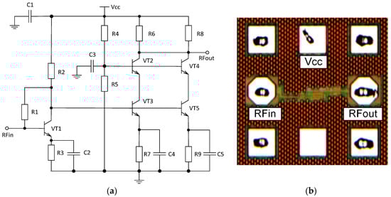 The driver unit schematic (Figure 6a) consists of input gain stage and output buffer stage to drive the segment of the modulator phase shifter. The input stage is implemented using a common-emitter configuration with parallel voltage feedback through the resistor R1 that provides matching and biasing for VT1. To increase the total voltage swing and output power of the driver unit, the second stage (VT3 and VT5, VT2 and VT4) is implemented as a cascode. In order to compensate the transistors’ gain roll-off and insert predistortion for high-frequency losses of the MZM phase shifter, the emitter capacitive degeneration networks are used in both the stages. When designing the driver unit, the capacitive load representing an input impedance of the MZM segment with length of L = 400 µm is taken into account. For this, the EM simulation of the modulator segment was performed.
