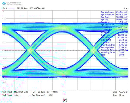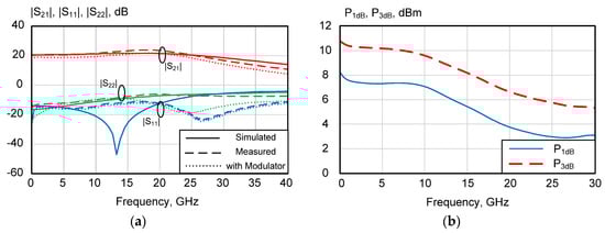 The driver unit was characterized on wafer using a probe station. Simulated and measured 50 Ohm S-parameters of the driver are presented in Figure 7. Also, its simulated generalized S-parameters taking into account the impedance of the modulator segment are also shown. The bias for the driver unit is Vcc = 5 V (Icc = 34 mA), so the total power consumption equals to 170 mW. The difference between the simulated and measured 50-Ohm |S11| can be explained by the parasitic capacitance and inductance in the input stage’s voltage feedback. The measured output power 1-dB compression point at the frequency of 20 GHz is P1dB = 3.8 dBm, and the saturation output power is more than 6 dBm. For 50 Ω load, calculated peak-to-peak output voltage in saturation is Vpp = 1.262 V, which gives us a differential peak-to-peak voltage Vppd = 2.5 V when the driver will be implemented as a differential stage. The measured eye diagram for the driver unit at 25 Gb/s (Figure 7c) demonstrates an open eye with an amplitude of 1.15 V and small variation of the group delay value.